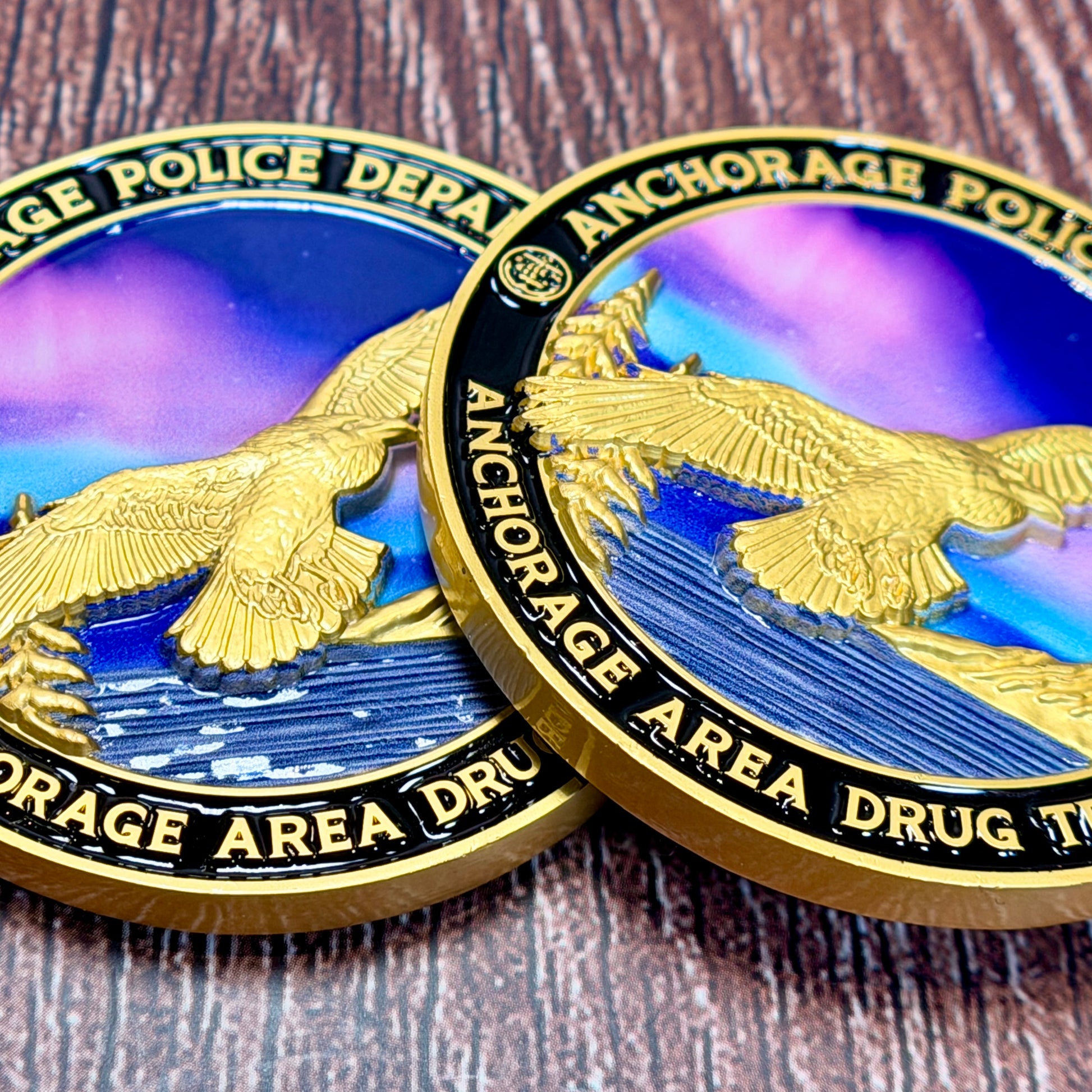 Command respect with this striking 2" matte gold challenge coin, officially representing the Anchorage Police Department, Alaska HIDTA, and the Anchorage Area Drug Team. Bold design captures the relentless mission of those fighting the front lines against drug trafficking in Alaska's largest city.
