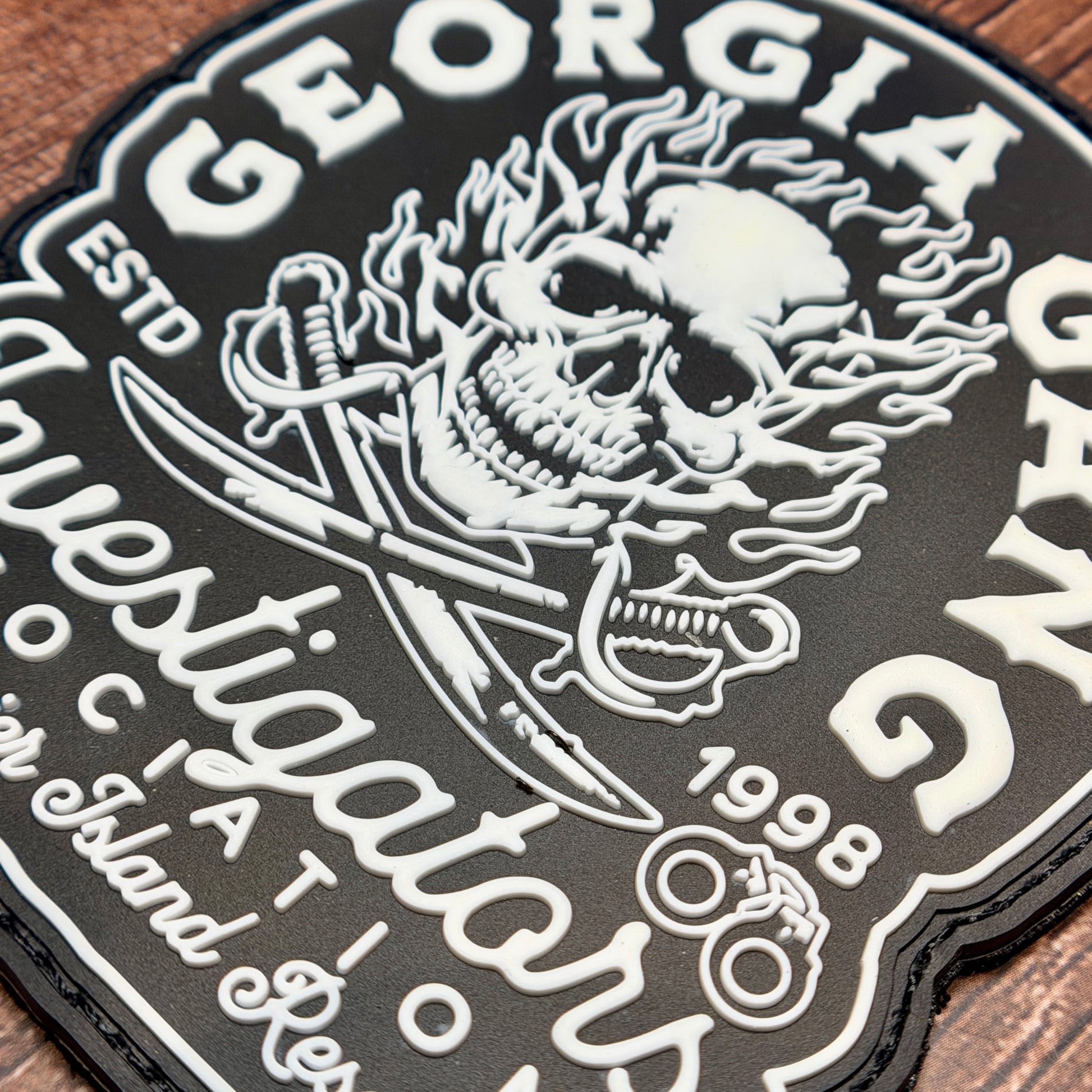 Grab this rad 4" PVC patch from the 2025 Georgia Gang Investigator's Association (GGIA) Summer Conference at Lanier Island Resorts! Built tough with durable PVC material and equipped with Velcro backing for easy attachment, this collectible glows in the dark for that extra cool factor. Perfect for displaying your conference pride on gear, bags, or uniforms. Pair it with the matching challenge coin to complete your official conference collection!