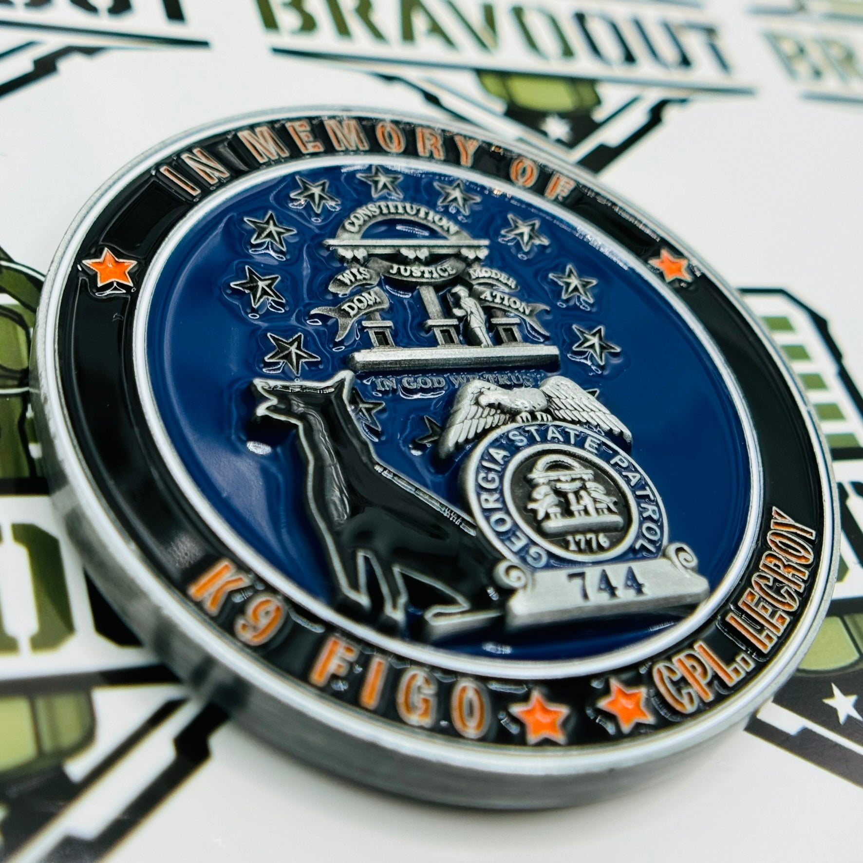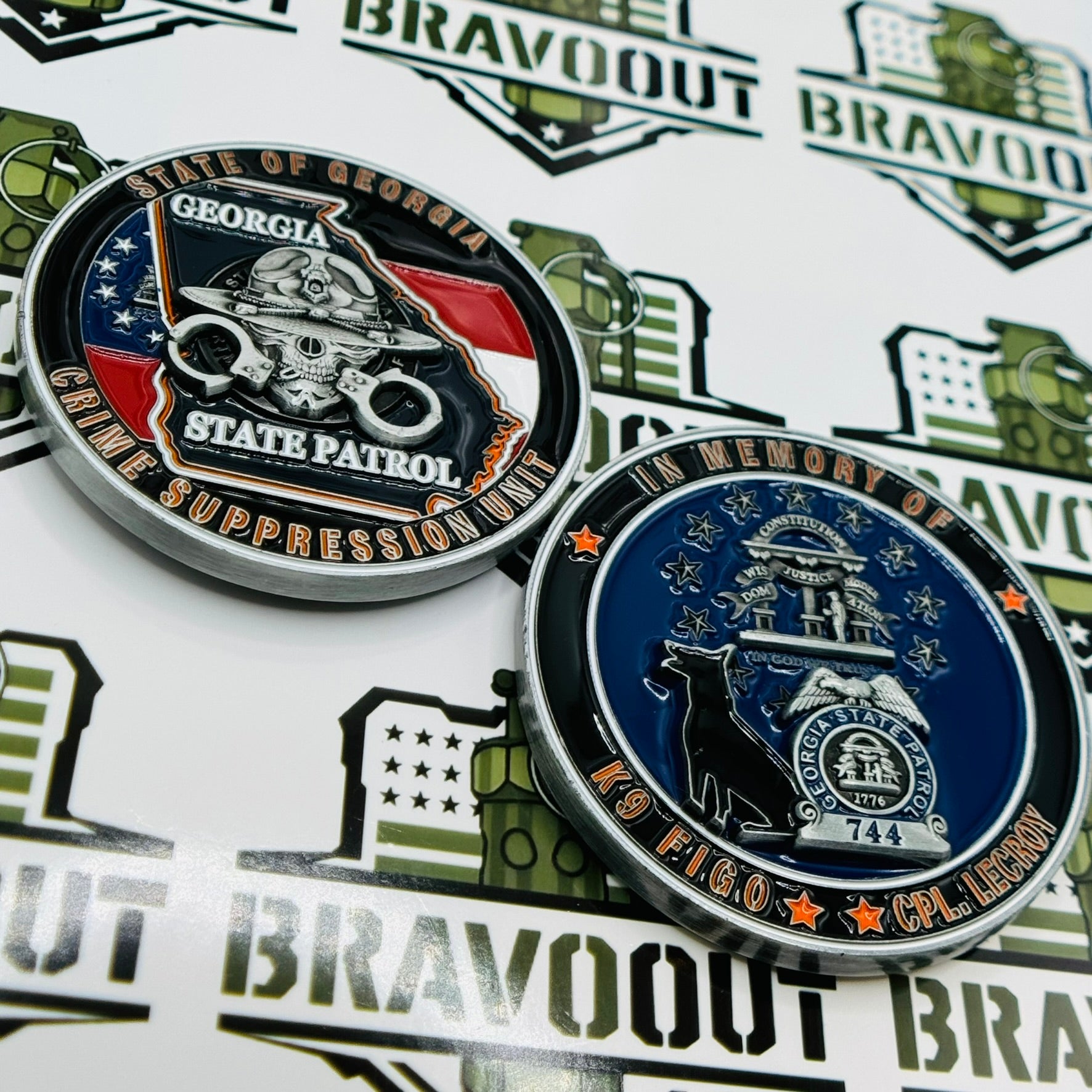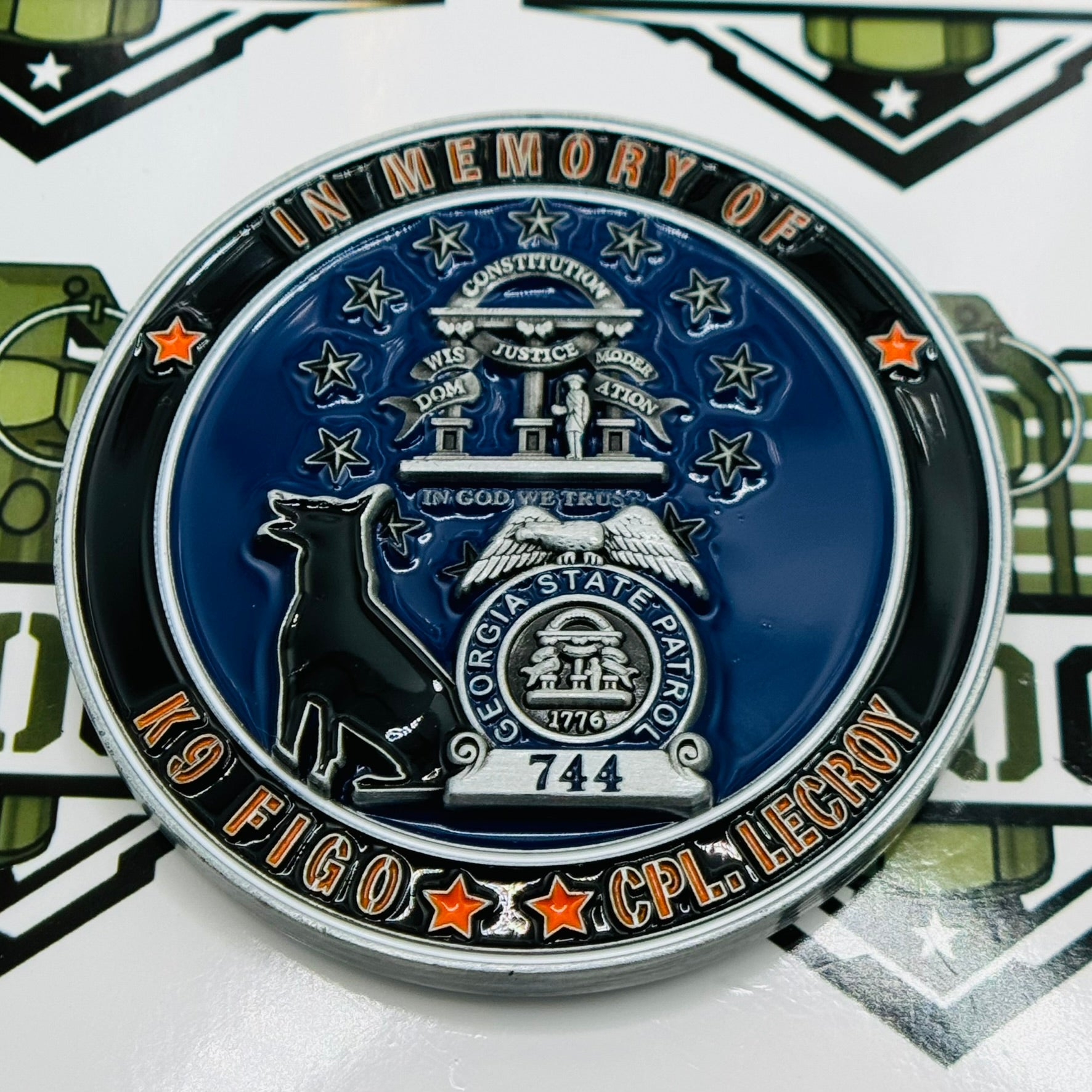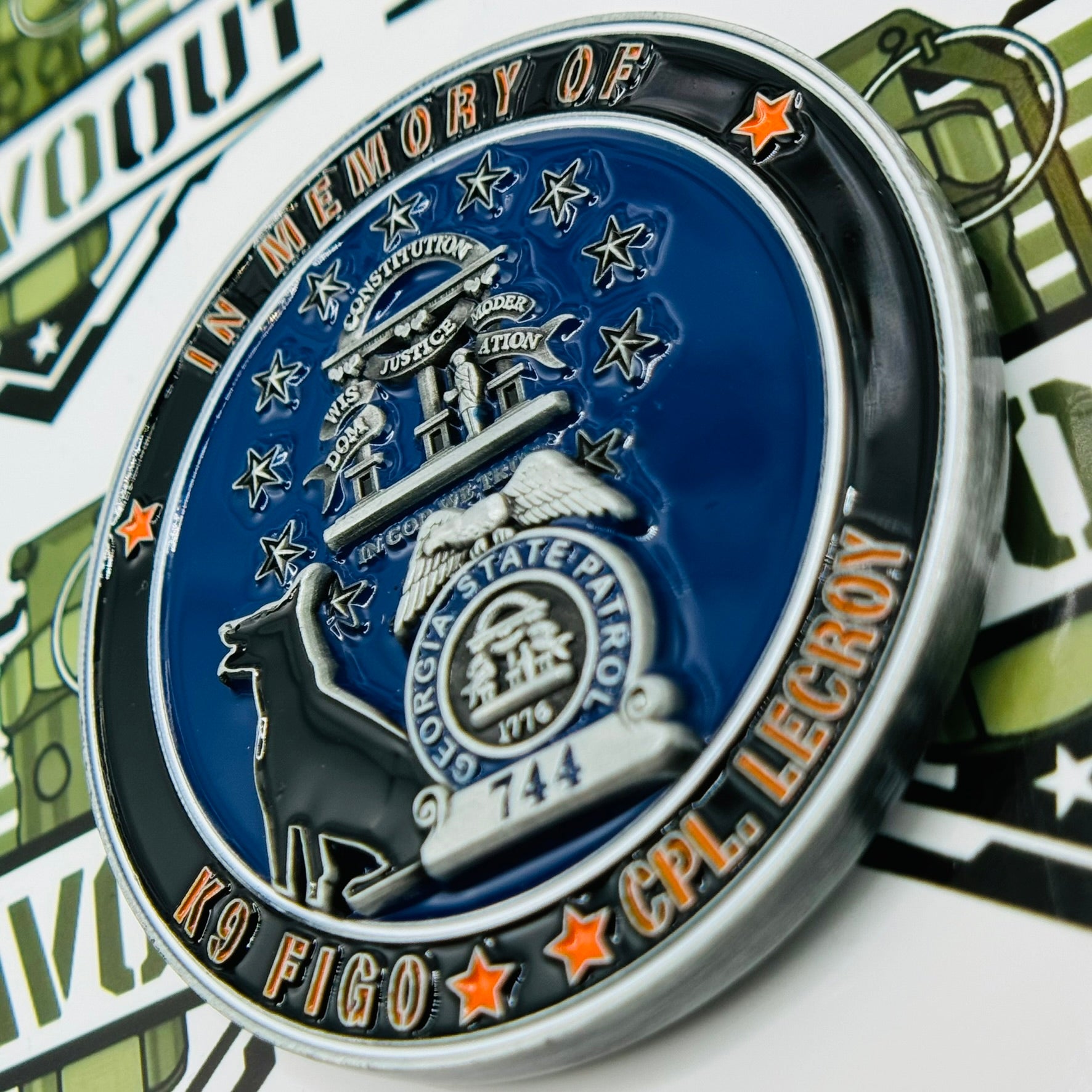 The Georgia State Patrol Crime Suppression Unit Challenge Coin is a commemorative item that pays tribute to the service and sacrifice of GSP Corporal Chadwick LeCroy #744 (End of Watch 12/27/2010) and GSP Crime Suppression Unit K9 Figo (EOW: 10/7/2022). This 2" diameter coin boasts a 4mm thickness and features a detailed 3D design on both sides with an antique silver finish.