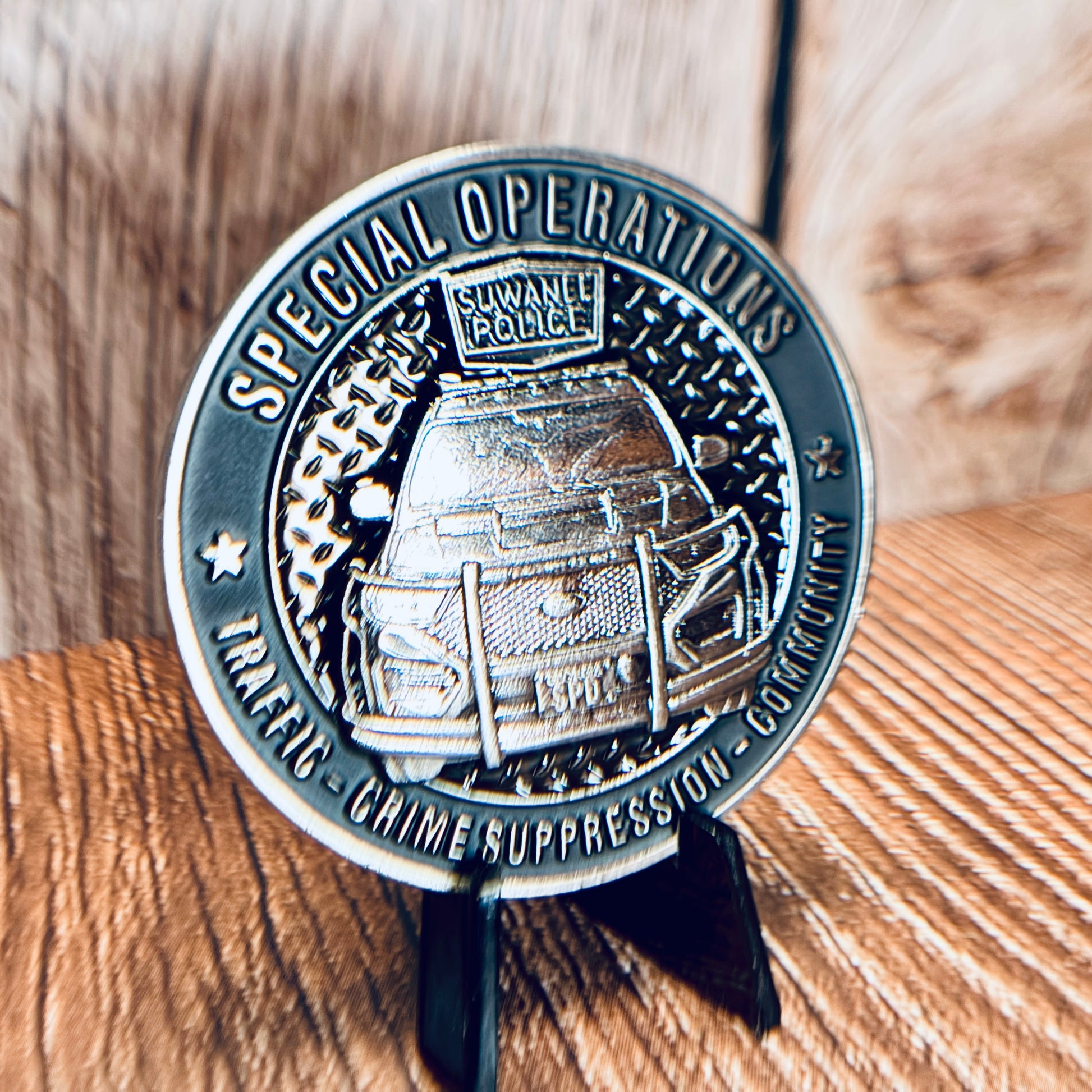 Honor the dedicated professionals of Suwanee Police Department's Special Operations unit with this official 2-inch challenge coin. These skilled officers demonstrate exceptional commitment to community safety through their focused crime suppression efforts and innovative tactical approaches. Their work speaks for itself—a testament to professionalism and service that deserves recognition. A meaningful keepsake celebrating those who go above and beyond to protect Suwanee.